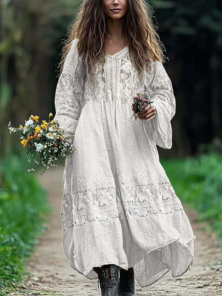 Vintage Floral Hollow Lace Patchwork Flowy Linen Maxi Dress