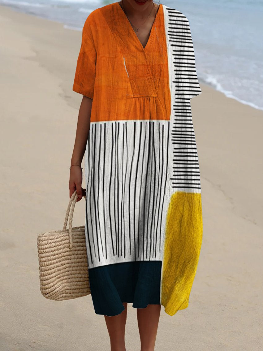 Multicolor Block and Line Decorative Pattern Flowy Dress