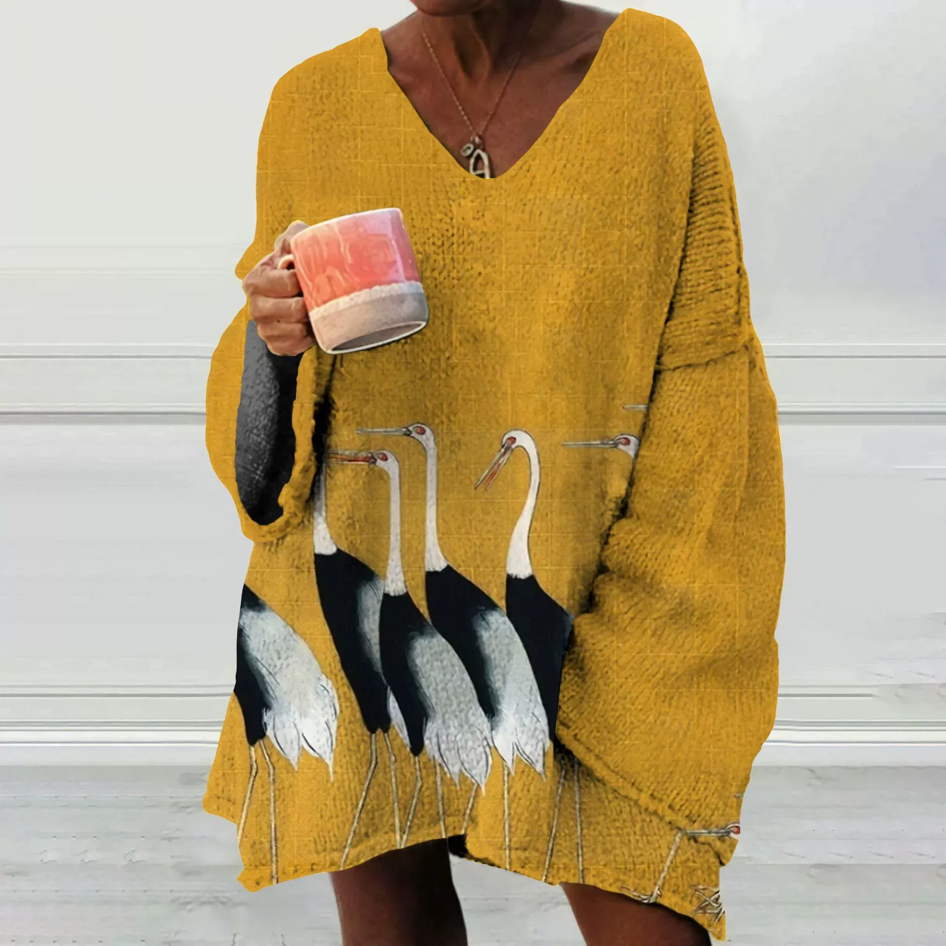 New women's retro art floral casual pullover sweater long sleeved loose fit dress