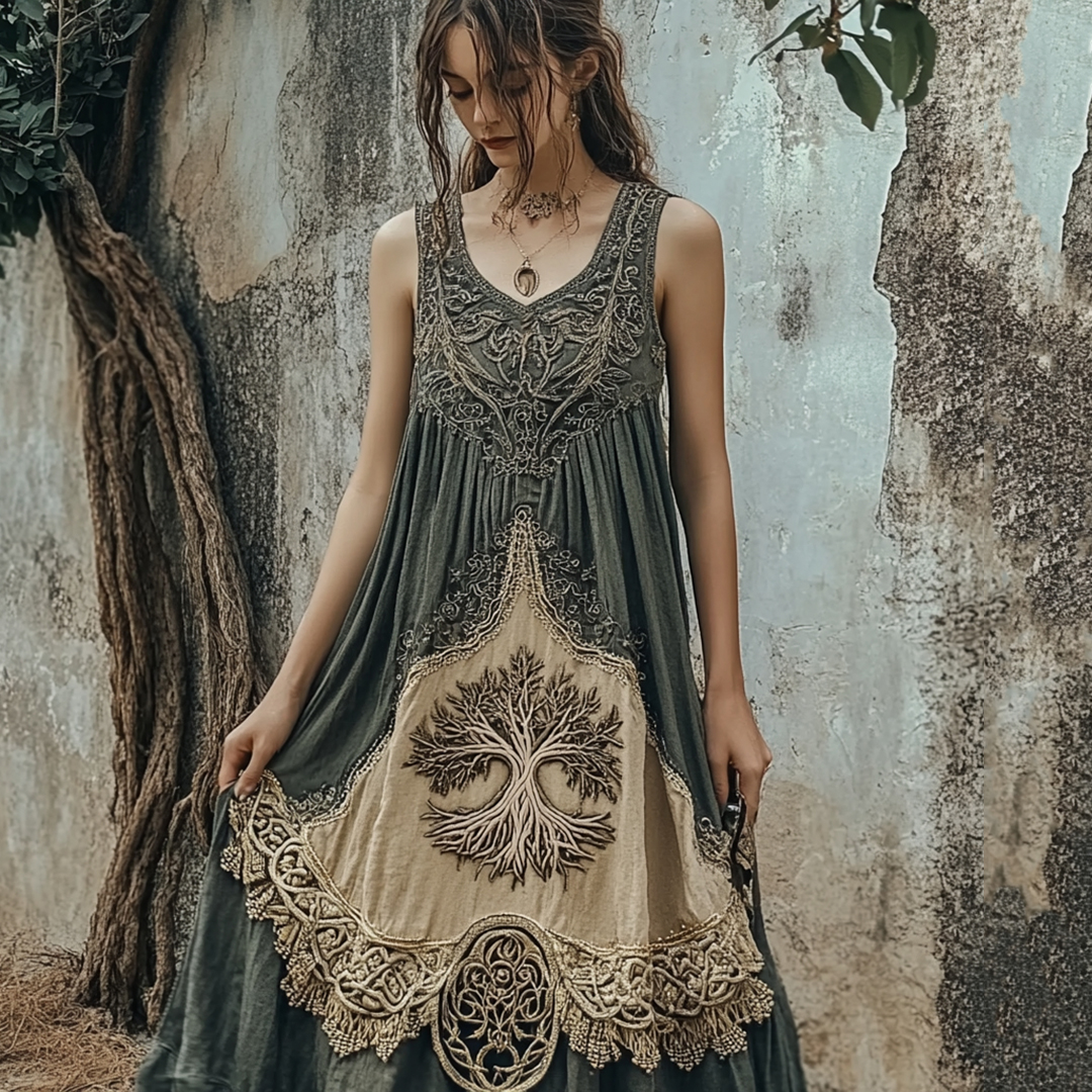 Vintage Tribal Viking Tree Of Life Celtic Knot Linen Blend Tank Midi Dress
