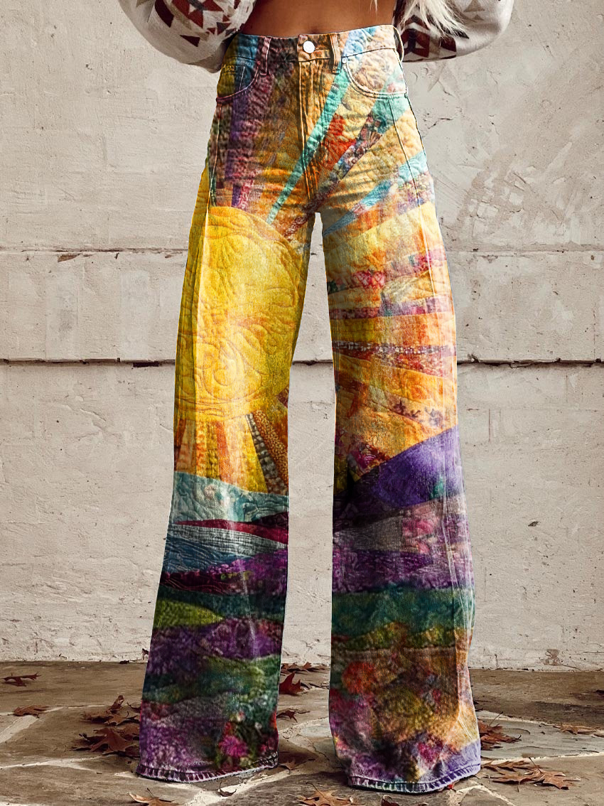 Women's Retro Colorful Sun Print Casual Wide Leg Pants