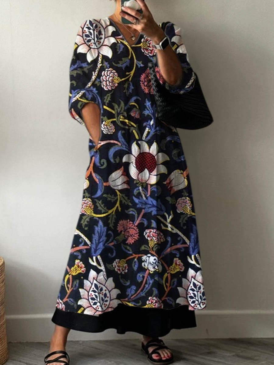 Women's Lovely Floral Art Print Pocket V-neck Cotton Dress