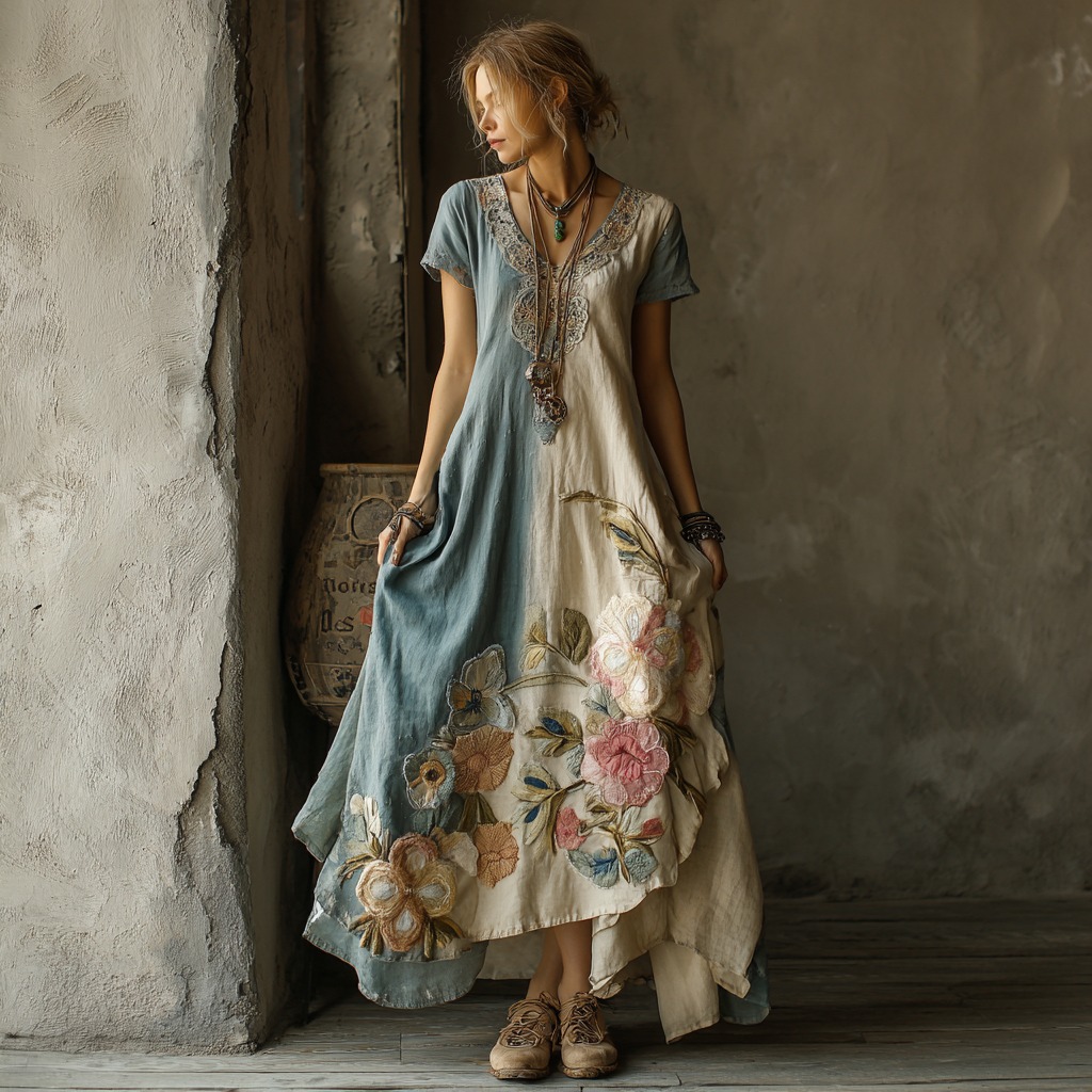 Women's Retro Floral Colorblock Short Sleeve Dress