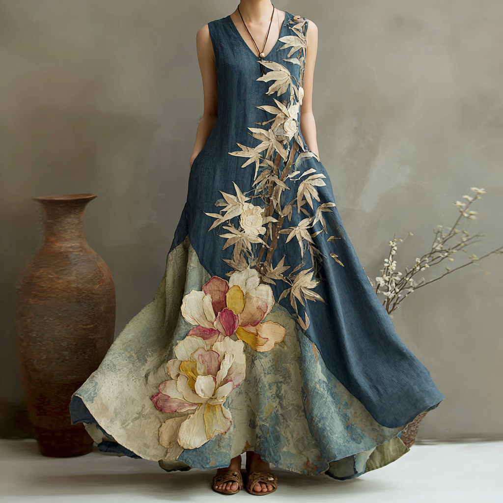 Women's Vintage Floral And Bamboo Art Print Linen Dress