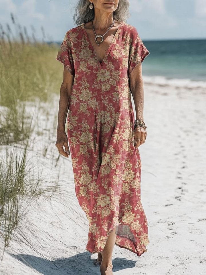 Women's Vintage Lovely Floral Art Print Pocket Cotton Dress