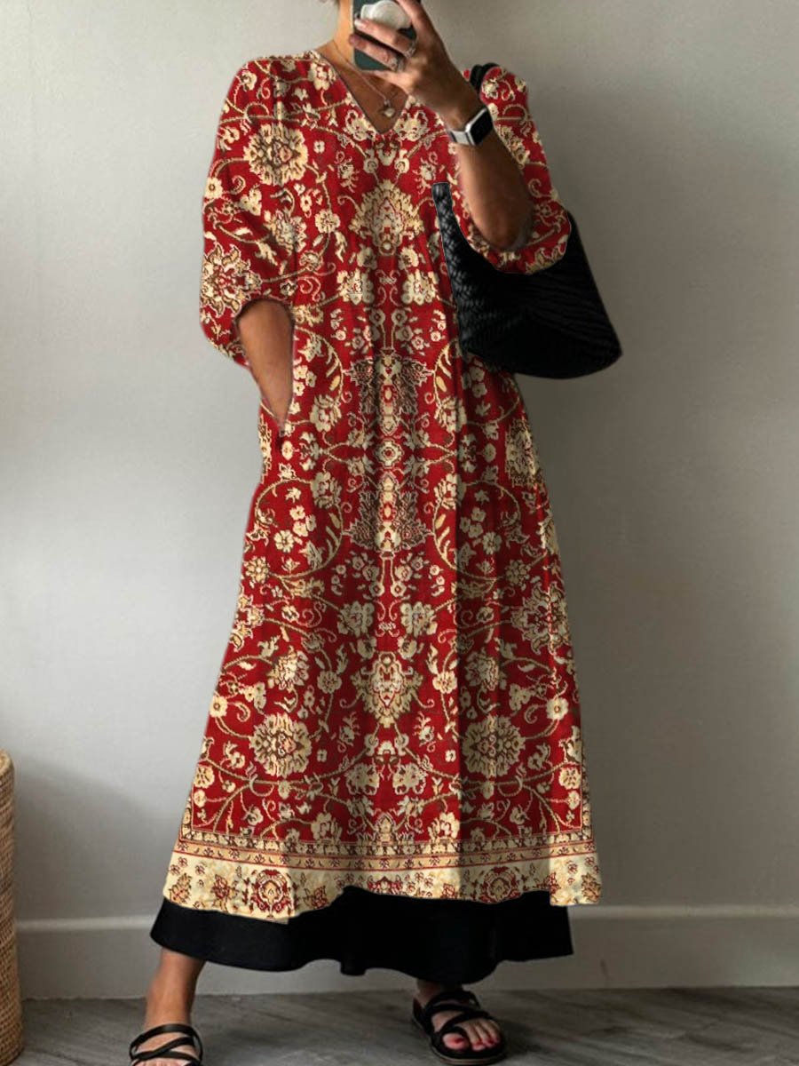 Women's Vintage Lovely Floral Art Print Pocket V-neck Cotton Dress