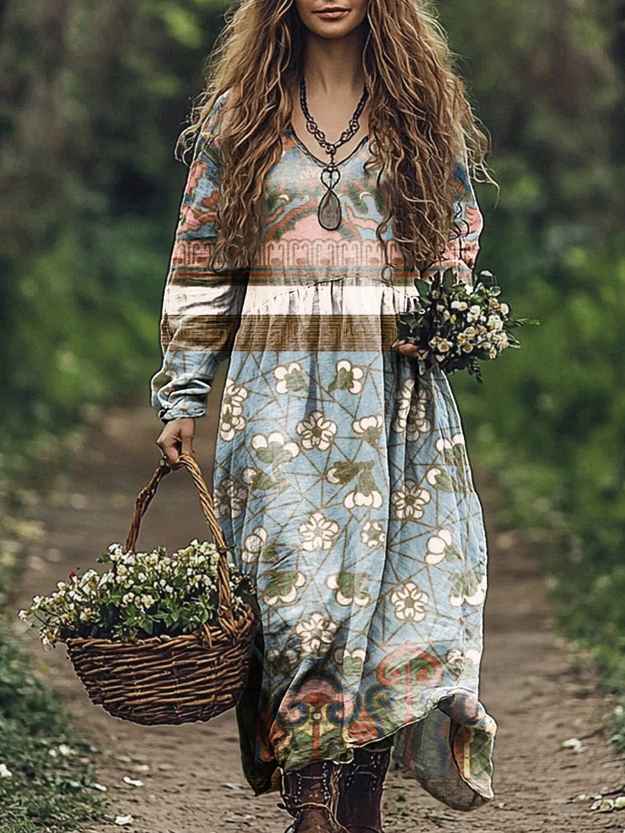 Women's Vintage Pattern Floral Art Print Pocket Cotton V Neck Long Sleeve Dress