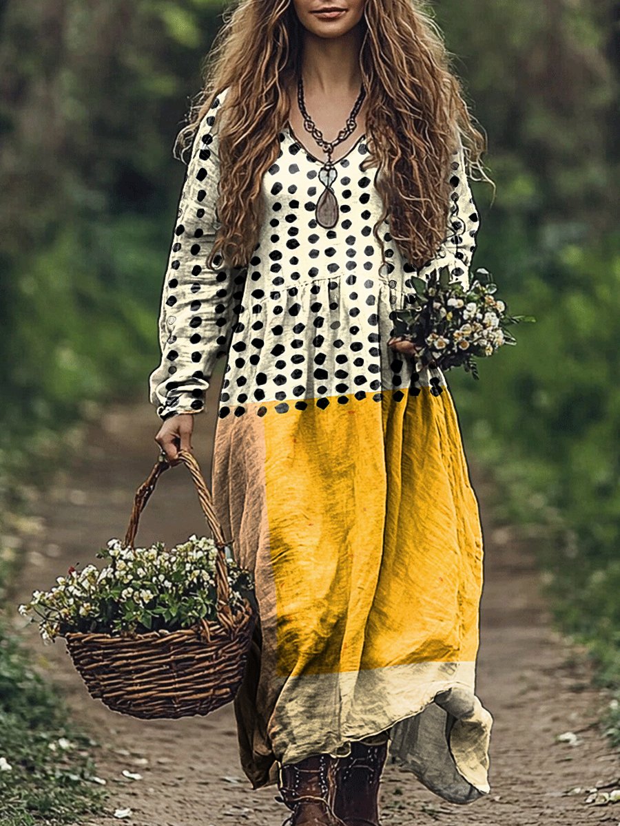 Women's Yellow Color-blocked Dots Print Pocket Cotton Dress